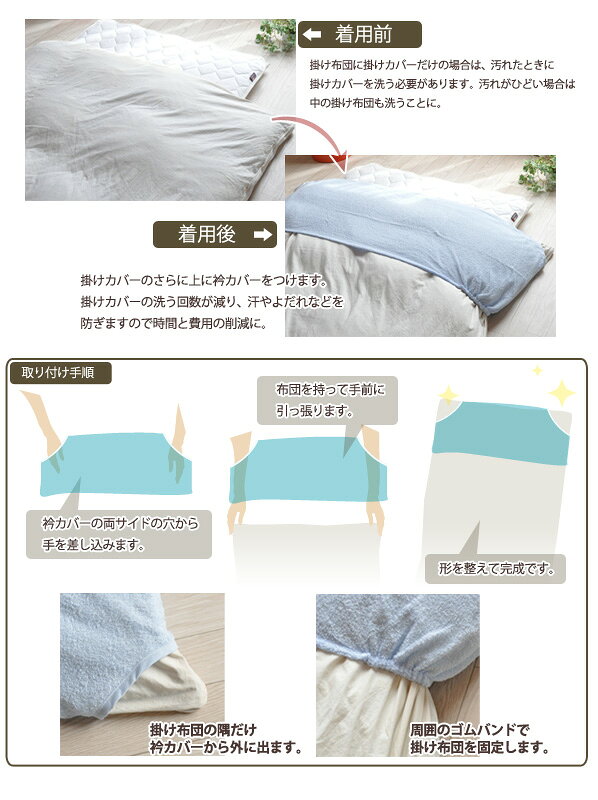 衿カバーをお使いになることで、掛ふとんや掛カバーを洗う回数は少なく済みますので毎日のお洗濯の手間暇も軽減できますよ。