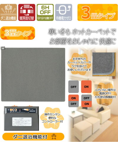 YAMAZEN ホットカーペット 本体(3畳タイプ)NU-301本体サイズタテ195×ヨコ235cm材質ポリエステル100%商品説明●原産国:インドネシア●3畳タイプ●表面温度:約45度(強)●消費電力:720W●消費電力量:約420wh●電気代目安(1時間あたり):11.3円/h●コード長さ:約1.5m●切り忘れ自動OFF:約6時間後に自動的に通電が切れる安心機能●待機電力ゼロ:電源コードを挿したままでも電源を入れなければ電気代ゼロ●左右面切替●ダニ退治機能●12折収納●やぐらコタツを置いて使用可能◆こたつ併用の際のご注意・こたつはカーペット本体の中央に置いてください・こたつの温度調節は(中)〜(弱)にあわせてください(強)に近い目盛にしますと、カーペット本体の温度調節器がはたらいて通電しないことがあります◆家具などを置かれるときのご注意・脚の細いテーブルやイスは必ず当て板や脚ゴムをしてください・キャスター付きのイスや家具を置かないでください(カーペット本体をいためる原因となります)・タンスなどの極端に重いものを置かないでください※こちらの商品は、2018年9月1日より一部仕様変更をしております【変更点】原産国:日本→インドネシア商品補足説明送料無料,送料込み,ヤマゼン,山善,通販,電気暖房,電気カーペット,足元暖房,電気マット,床暖房